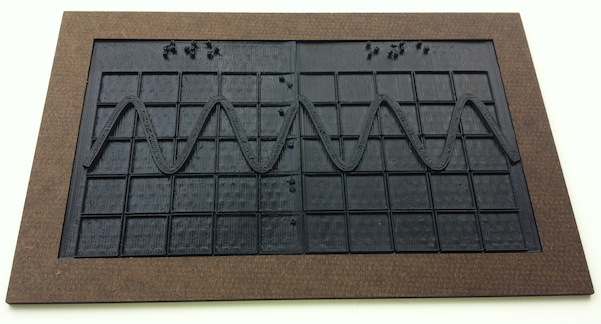 Caption: 3D printed visualization of equation Y = cos(X*3) +3. Visualization has two printed pieces 3”x4” that are held together with a laser-cut hardboard frame.