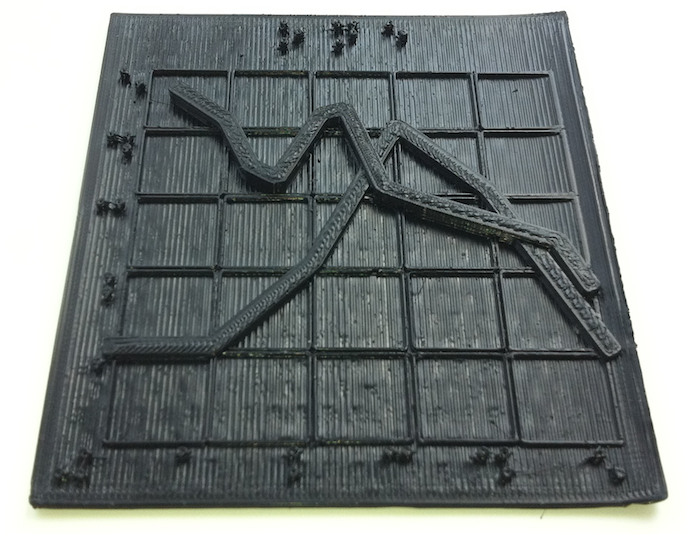 Caption: 3D printed visualization of a graph of multiple intersecting lines. The VizTouch software automatically generated the 3D model of this prototype from a spreadsheet data file. The visualization’s title and axis labels are printed in Braille.