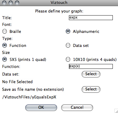 Caption: Example of the VizTouch interface which allows a user to create a tactile visualization by either typing an equation or uploading a spreadsheet data file.