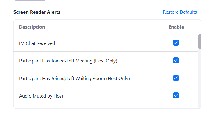 A friend at the National Federation of the Blind informed me of this: two weeks ago, Zoom provided an accessibility update that added new features for screen readers. It allows users to select which alerts it reads aloud. The options provided are: